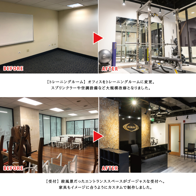日本の既存店舗を見学し、コンセプトを把握した上でライザップブランドを意識しデザインしました。想定通りの仕上がりで、工期と予算も当初の計画通りに完遂しました。