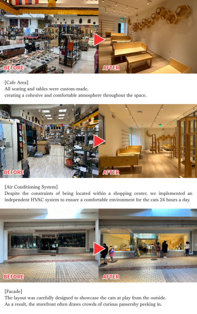 Since cat cafe are virtually nonexistent in the U.S., obtaining a building permit was particularly challenging. However, the project was successfully completed on time and within budget.